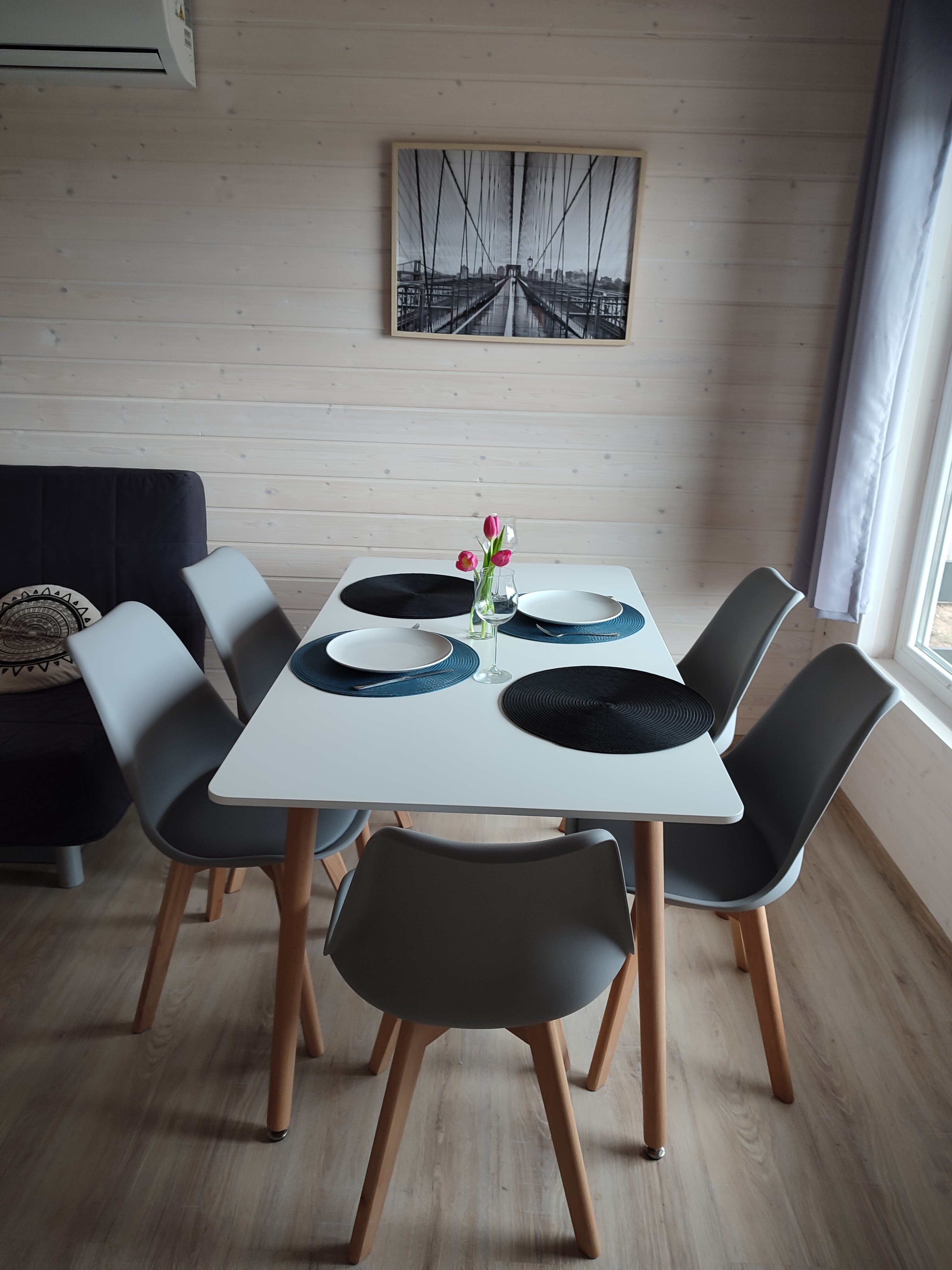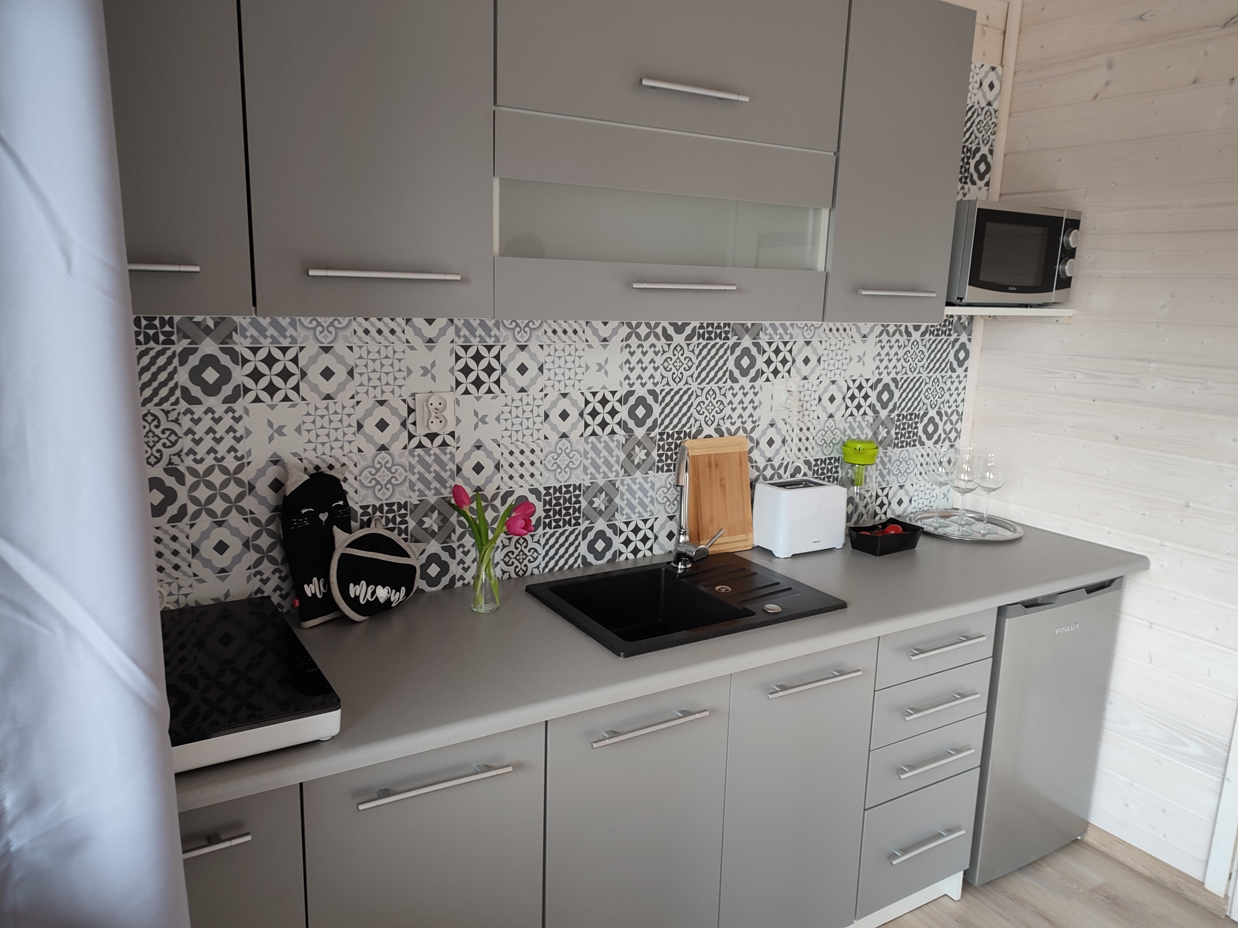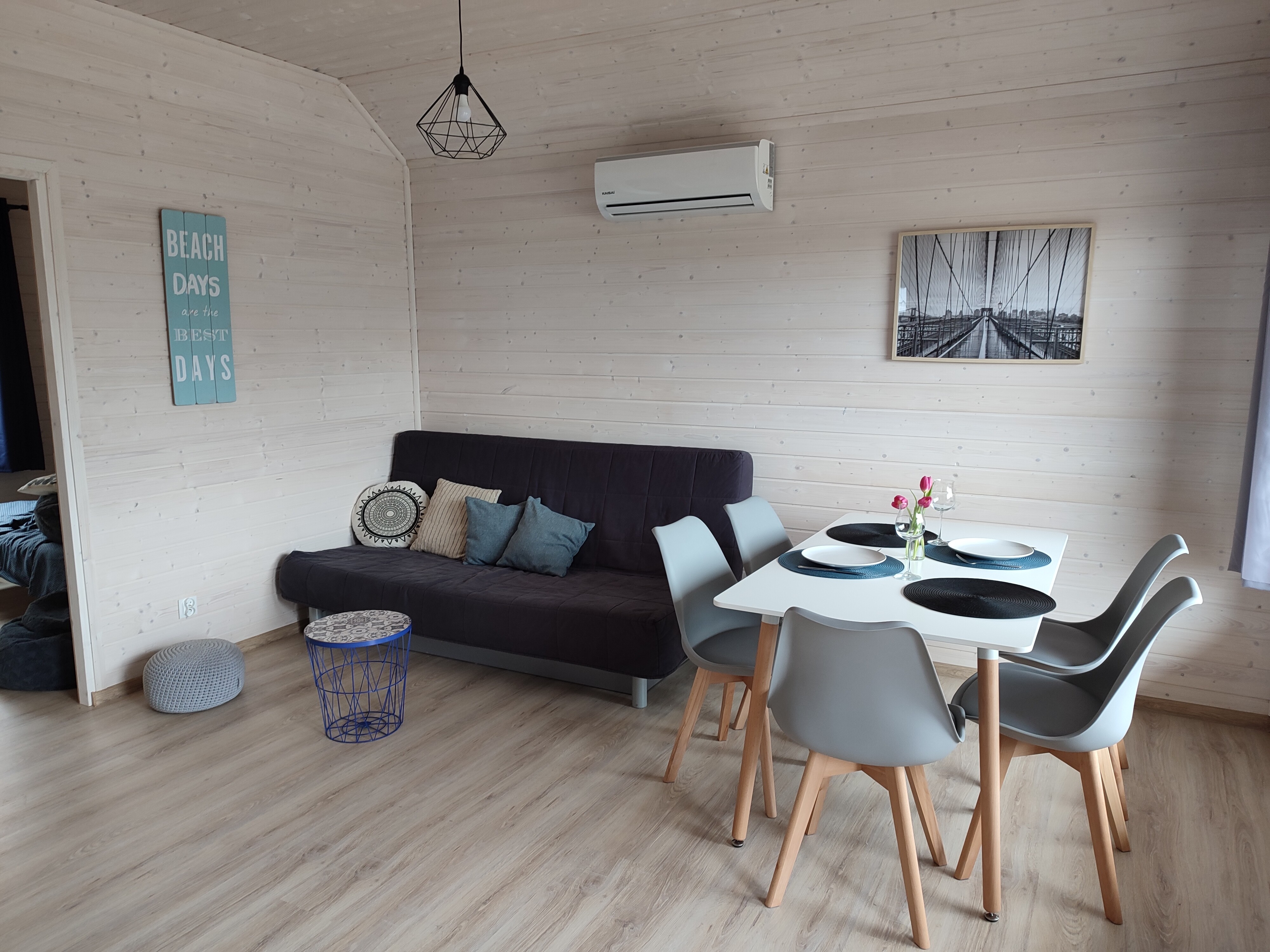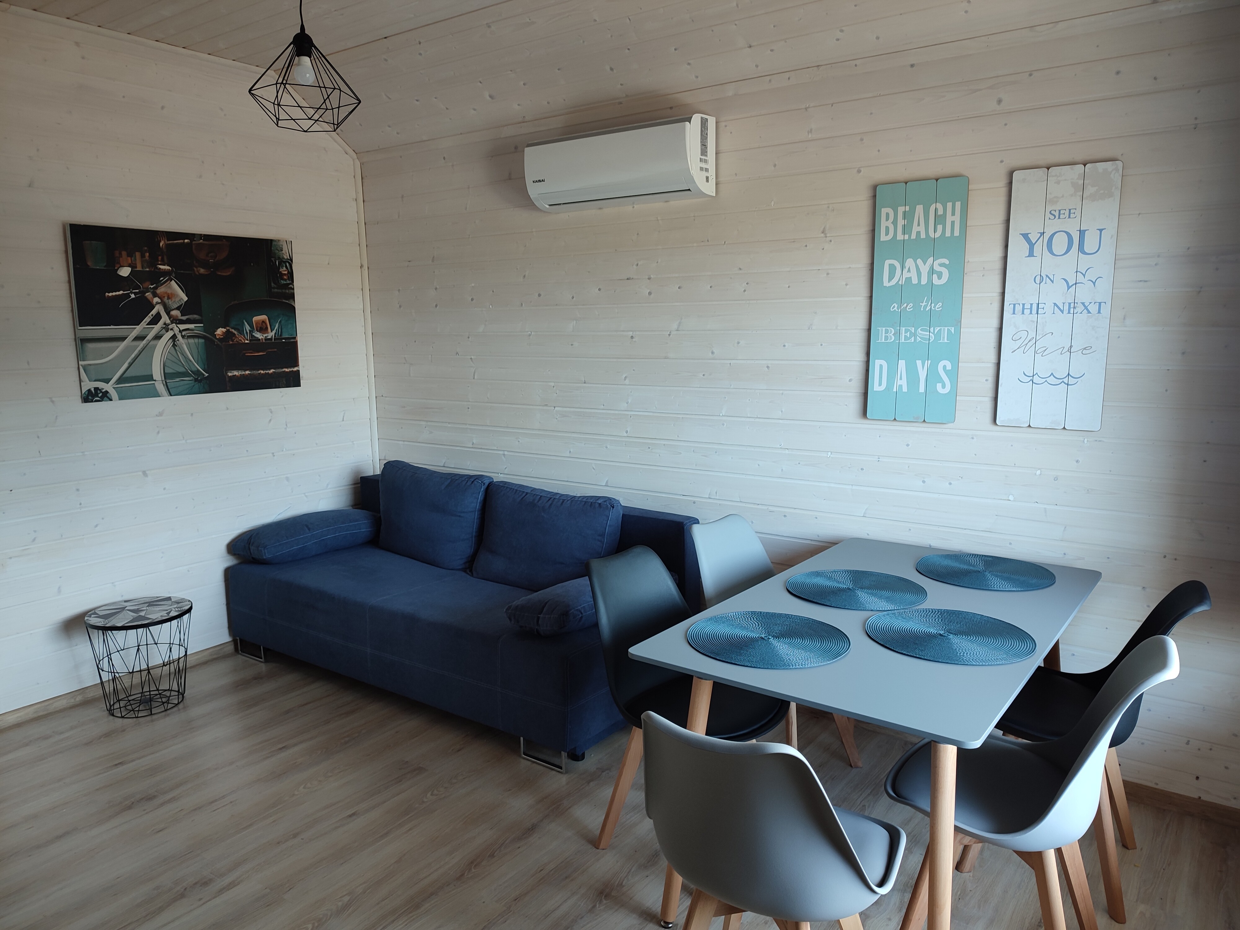 4 nowe domki z jedną sypialnią i własnym tarasem (typu bliźniak), wyposażona kuchnia, klimatyzacja (ogrzewanie), grill, bezpłatny parking