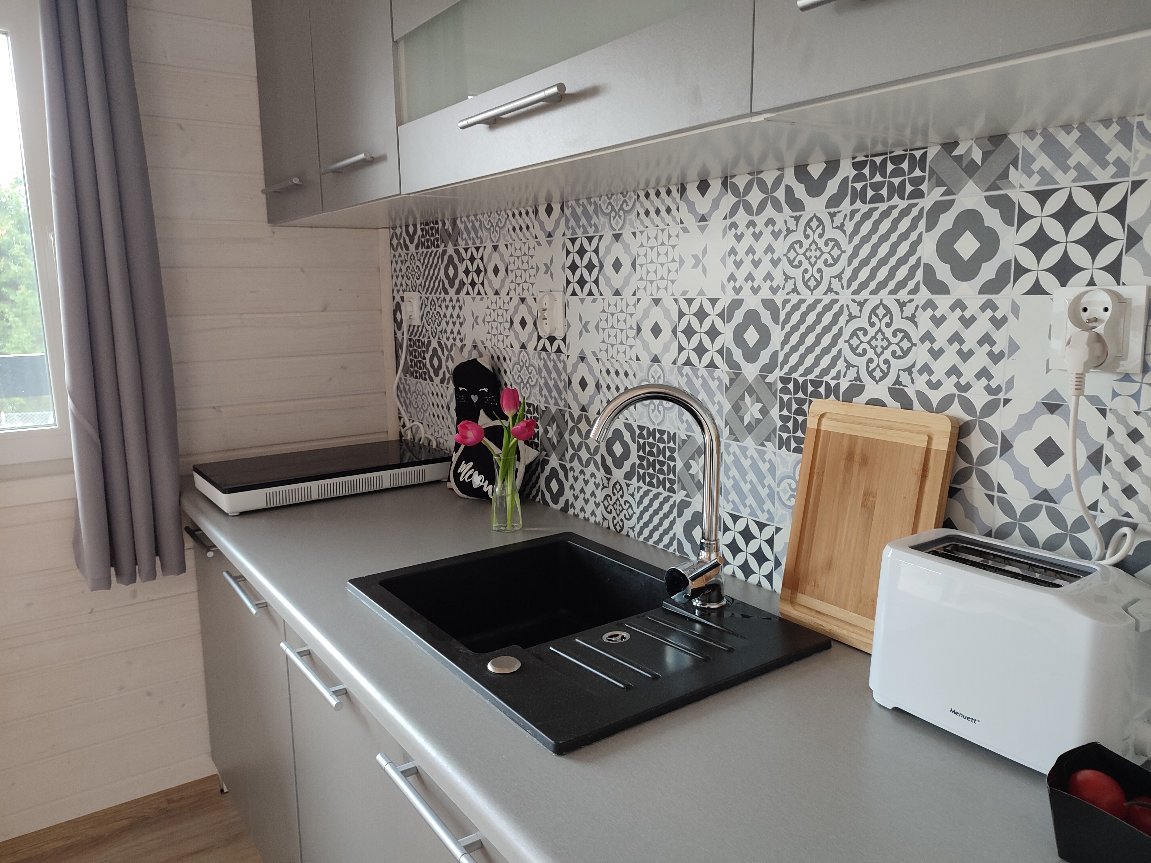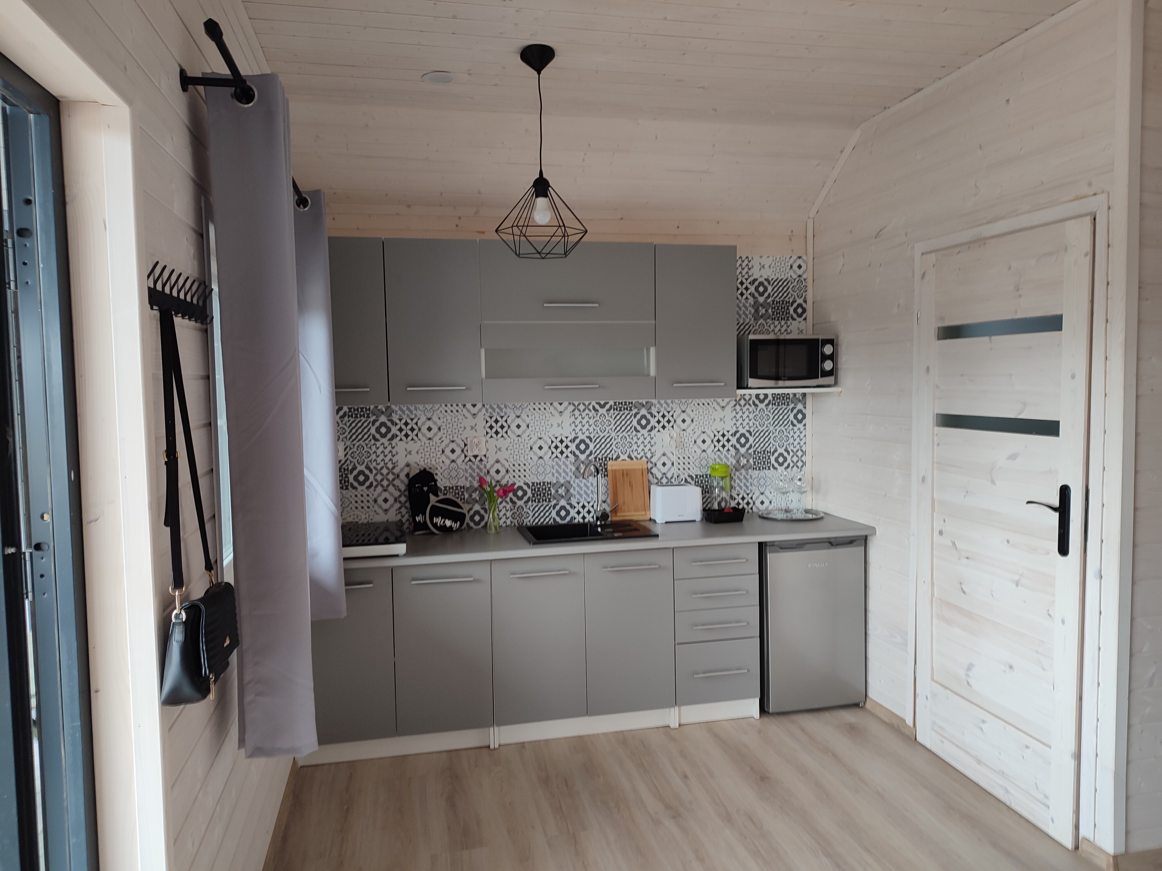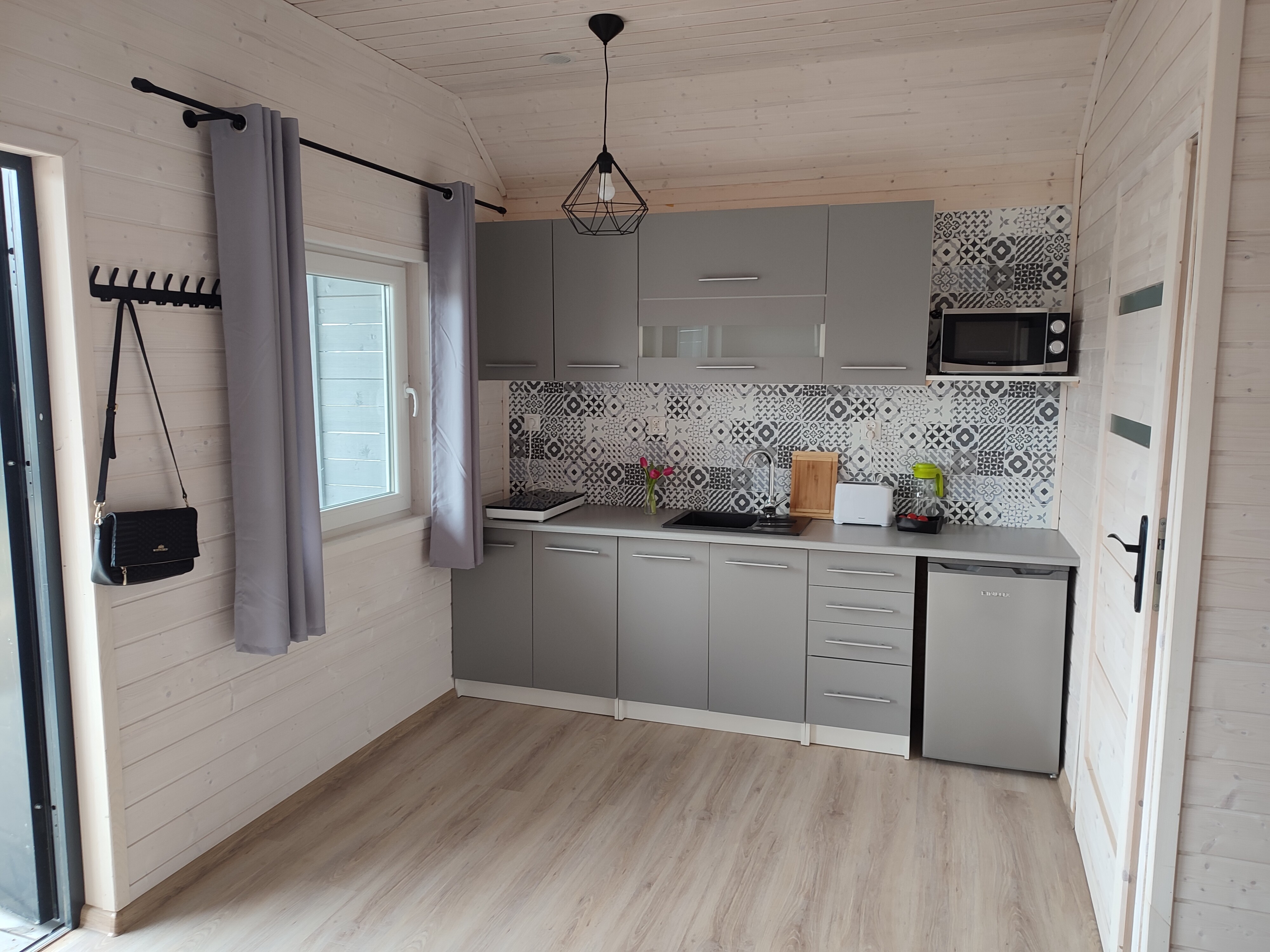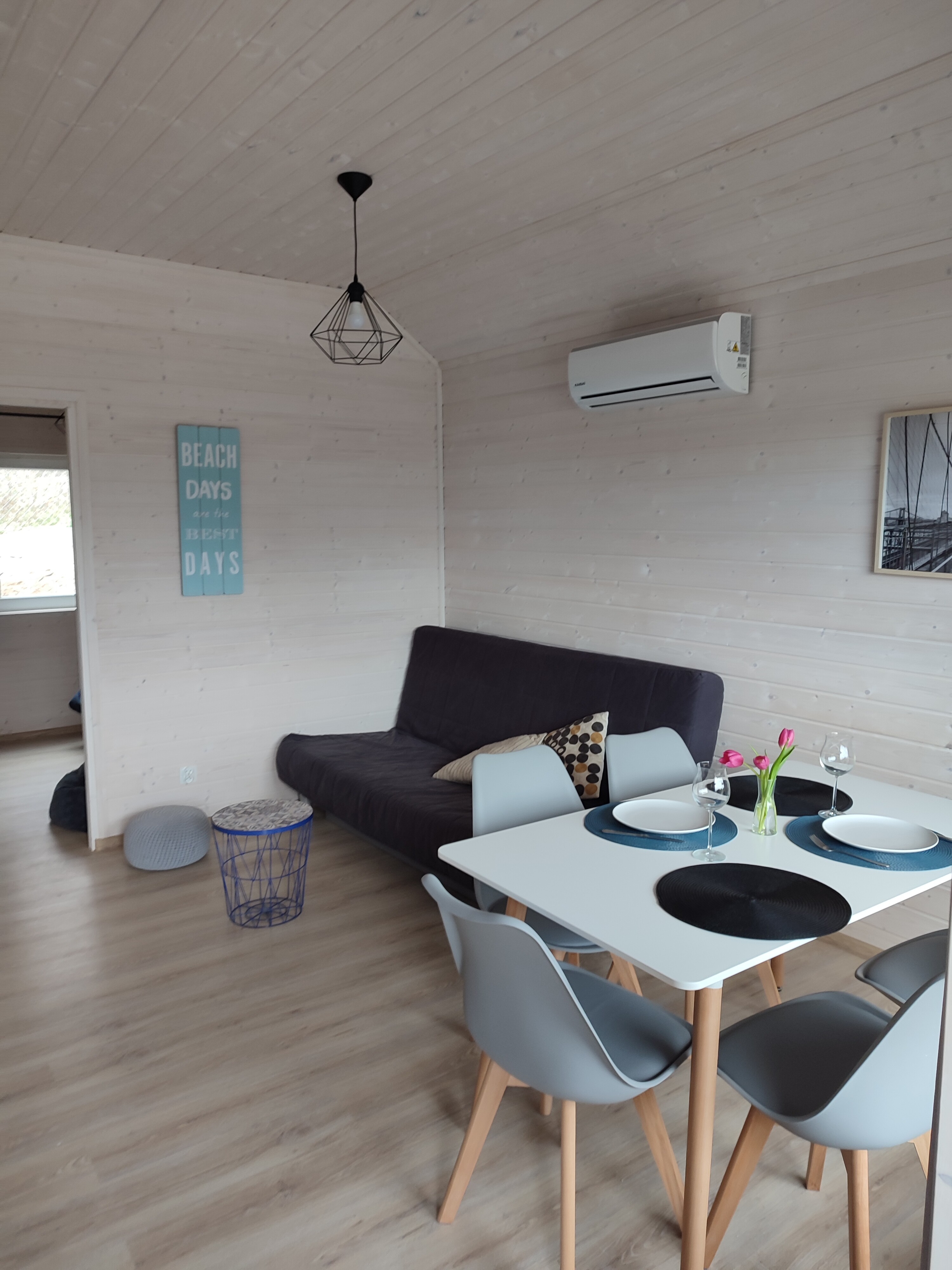 4 nowe domki z jedną sypialnią i własnym tarasem (typu bliźniak), wyposażona kuchnia, klimatyzacja (ogrzewanie), grill, bezpłatny parking