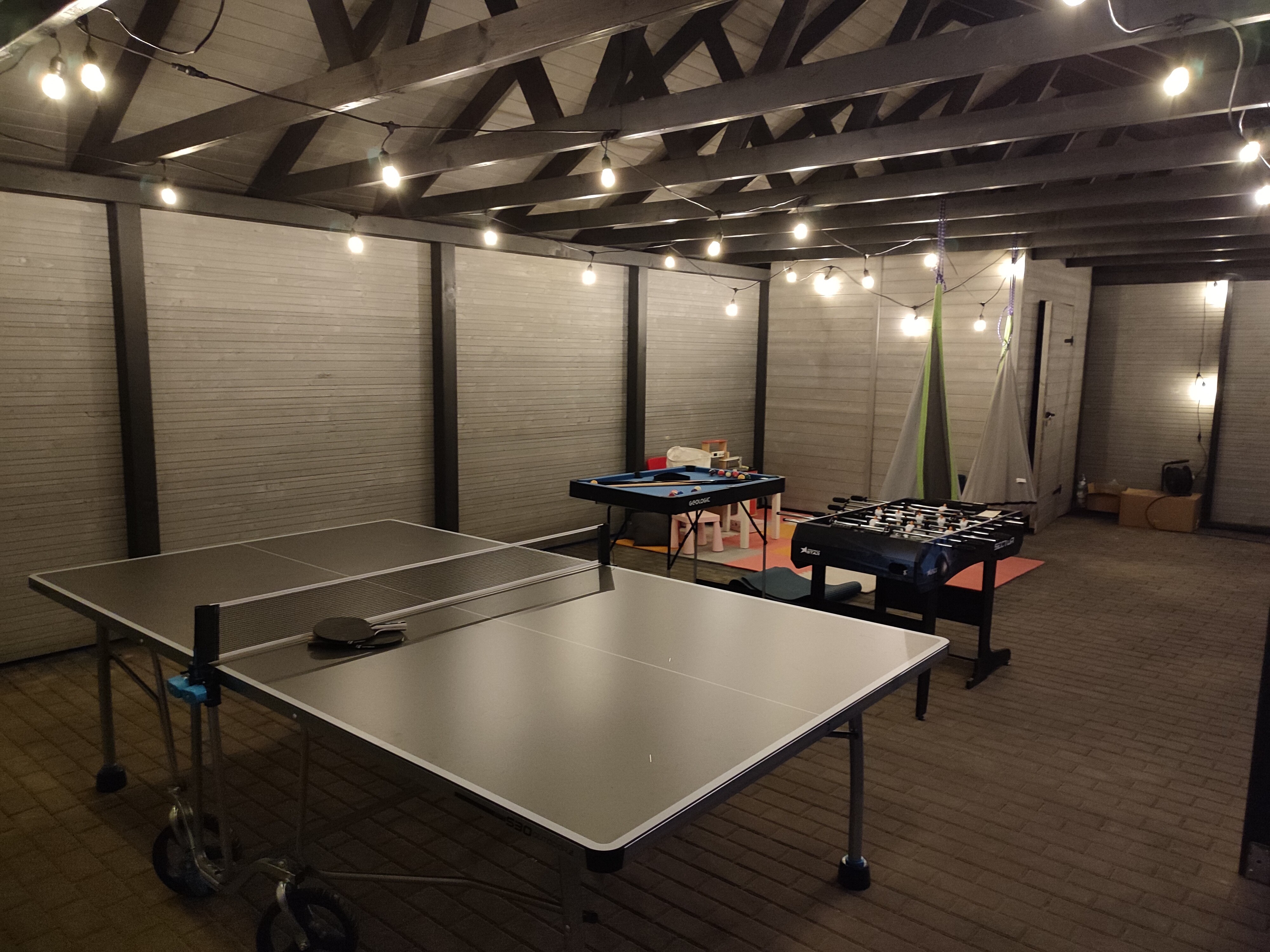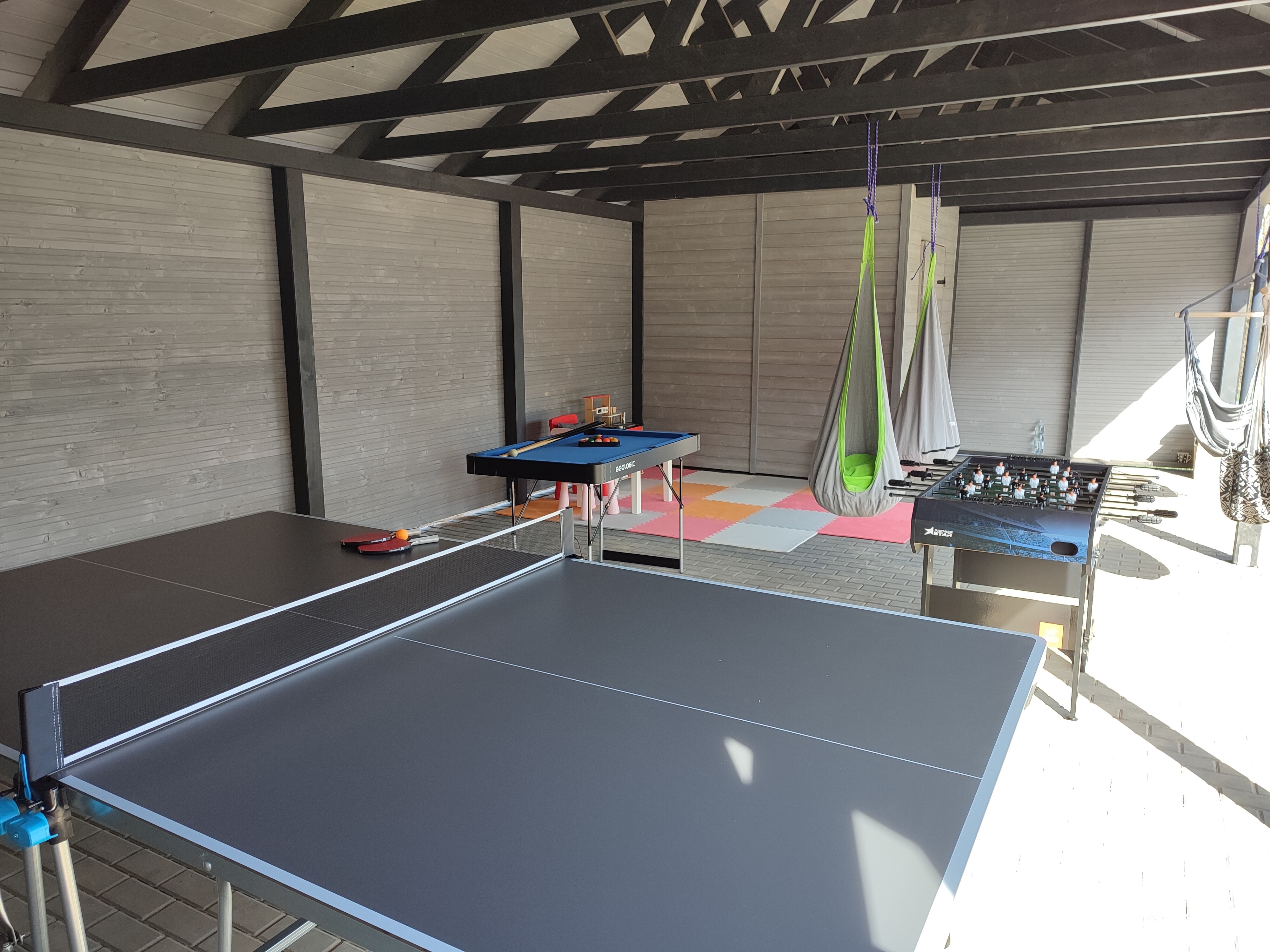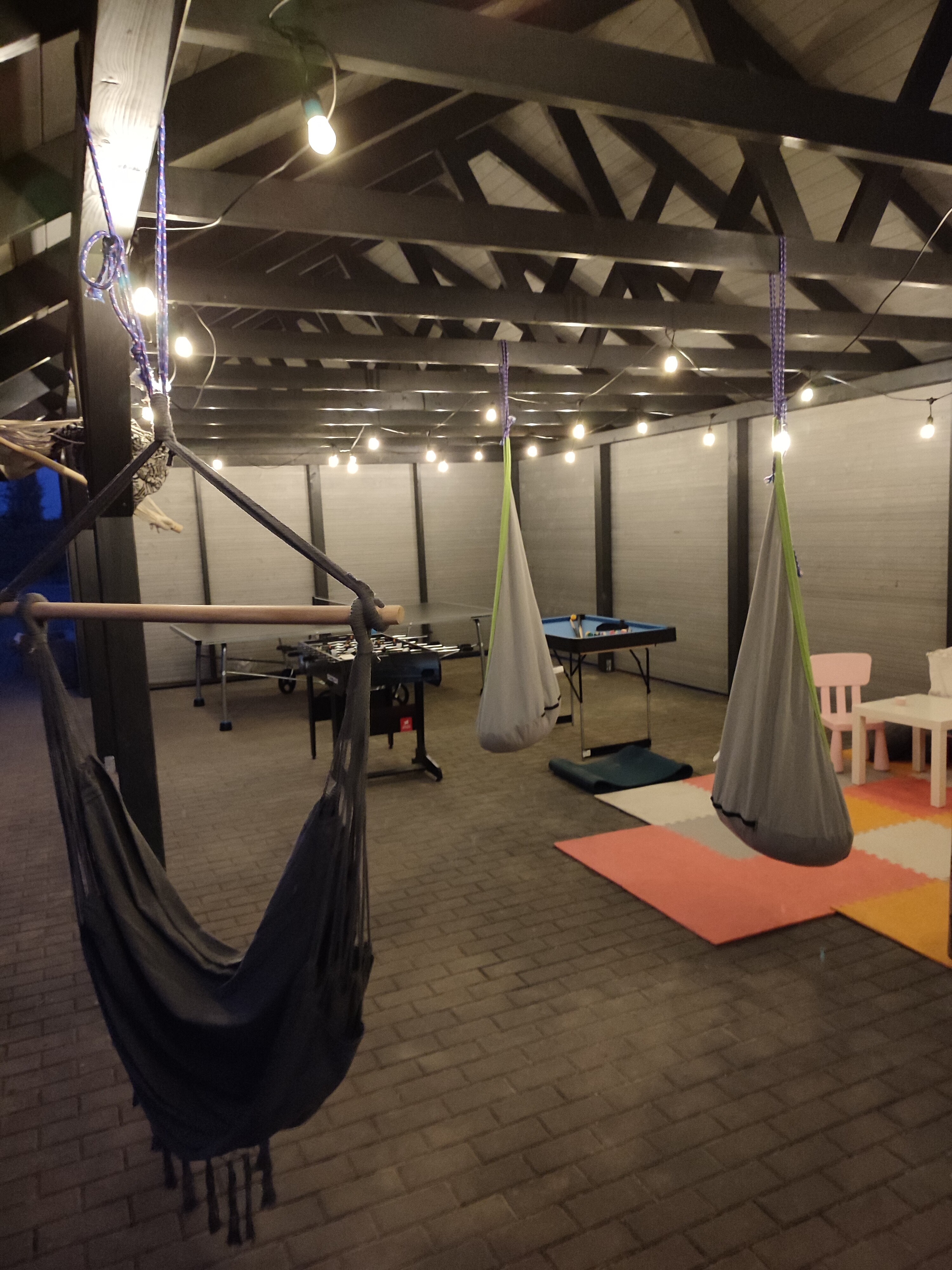 Basen z podgrzewaną wodą, plac zabaw, trampolina, piaskownica, wiata (ekspres do kawy, tenis stołowy, piłkarzyki, mini bilard, fotele hamakowe), zabawki i gry dla najmłodszych oraz dużo miejsca do zabawy i wypoczynku, zaciszna i zielona okolica
